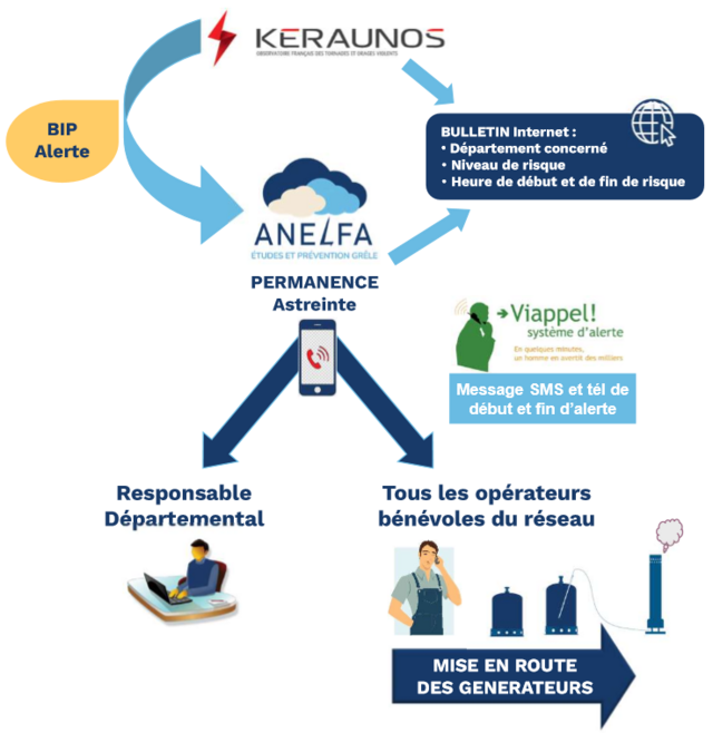 La prévention des situations à grêle fait l’objet d’une convention nationale passée entre l’ANELFA et Kéraunos. Les prévisions sont faites quotidiennement sur 20 zones (qui correspondent souvent à un département) puis centralisées au niveau de l’ANELFA.