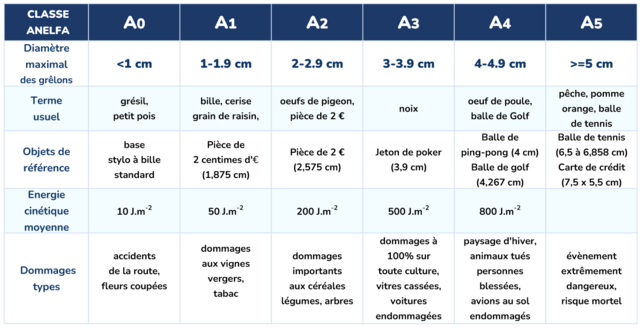 L’échelle proposée par l’ANELFA est basée sur la mesure de près de 4000 chutes de grêle enregistrées en France depuis 1988 sur ses réseaux de grêlimètres. La conception physique de cette échelle a été présentée à la troisième Conférence Européenne sur les Orages Violents qui a eu lieu à Leon (Espagne) du 9 au 12 novembre 2004, et elle est décrite en détail dans l’article suivant :