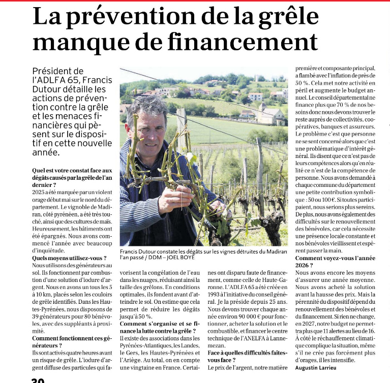 | La prévention de la grêle manque de financement | Article sur l’Assemblée Générale de 2026 | La Dépêche du Midi du 28/02/2026 | ■ |